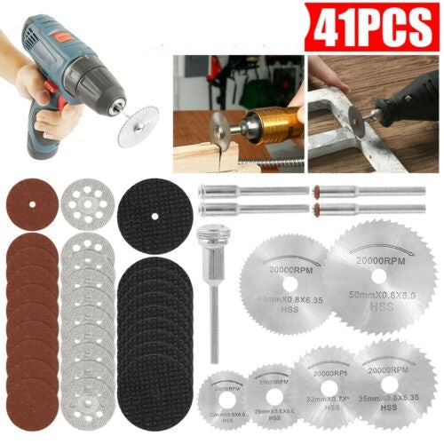 【This rotary tool kit has 3 types of discs for your 3 needsã€?--CUTTING, GROOVING & TRIMMING. It includes: 10 x diamond cutting wheels, 10 x of resin cutting wheels, 6 x HSS wood cutting circular saw blade discs, 10 × red resin cutting wheel cut-off discs & 5 × Mandrels