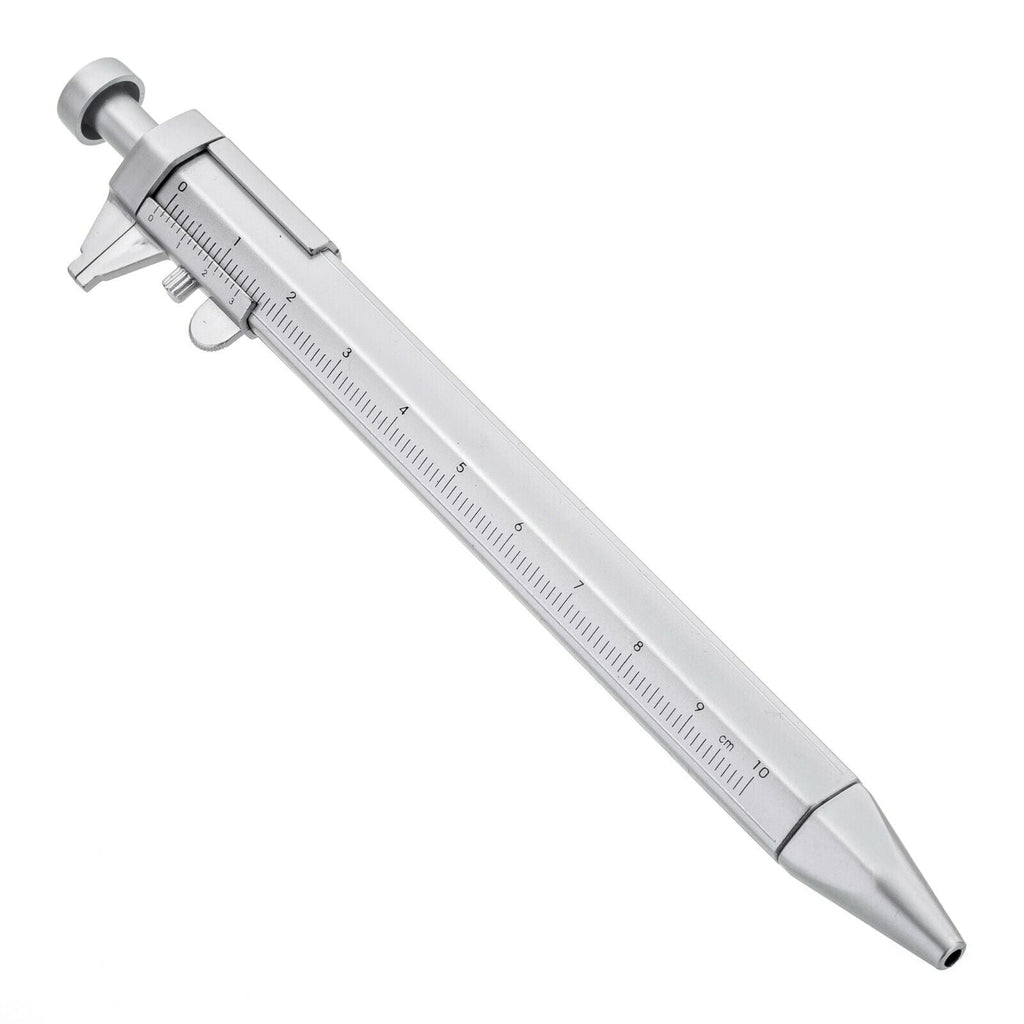 Vernier caliper + ballpoint pen, used for student use.