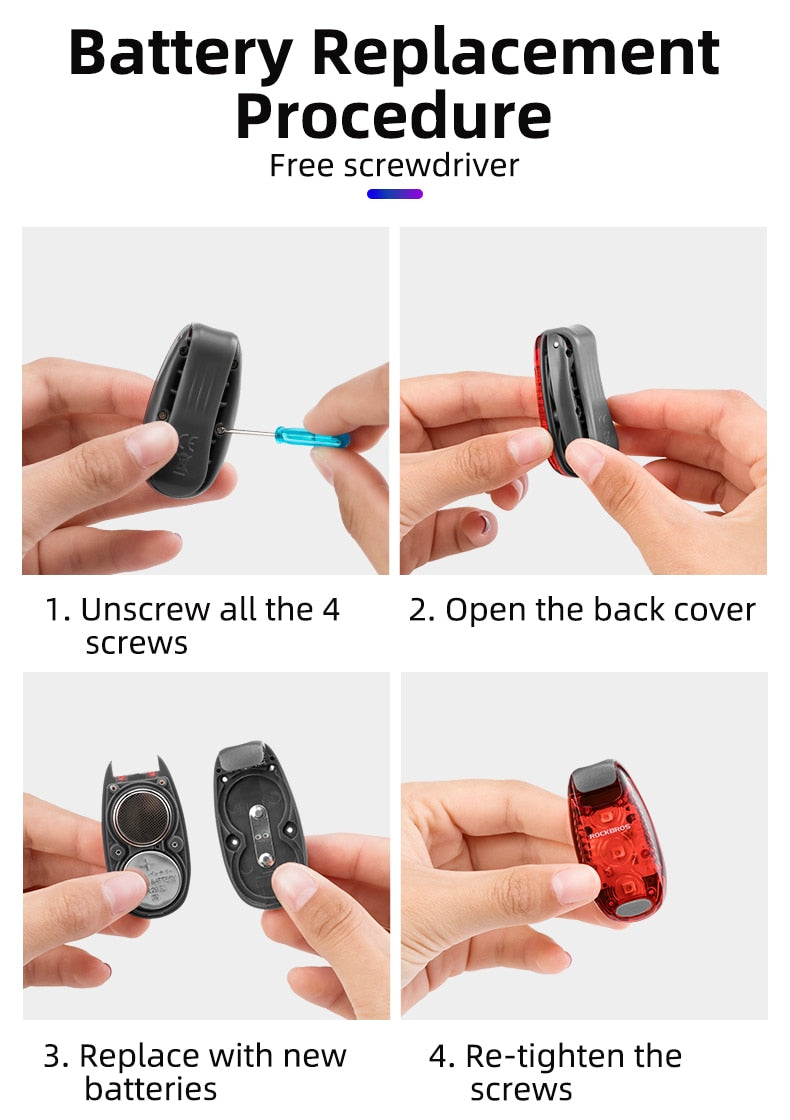 Battery installation: Use a Phillips screwdriver to unscrew the 4 screws on the back of the tail lamp, open the tail cover and press the positive and negative tips in the battery compartment, and insert 2 CR2032 batteries.